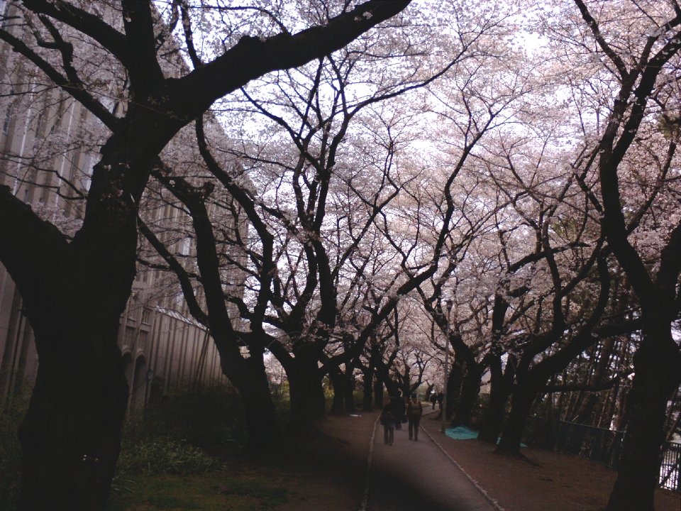 桜が七分咲きくらいになりました。そこで、一駅前の市ヶ谷で降りて、線路沿いの土手みたいになっている桜並木の中を歩きました。 |