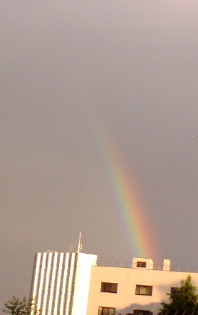 会社から駅に向かって歩いていたら、空に向けて携帯で写真を撮っている人がいました。「貴重な建物があるわけでもないのに、何を撮っているのだろう?」と不思議に思って携帯の先を見てみたら、虹が天空を突き刺すかのように切り立っていました。 |