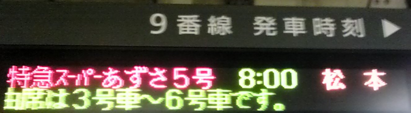 もちろん、8時ちょうどのあずさに乗ったからといって、何か特別な事があるわけでもありません。でも、相方の勧めもあり、駅に表示されていた「8時ちょうどのあずさ」を記念に撮ってもました。