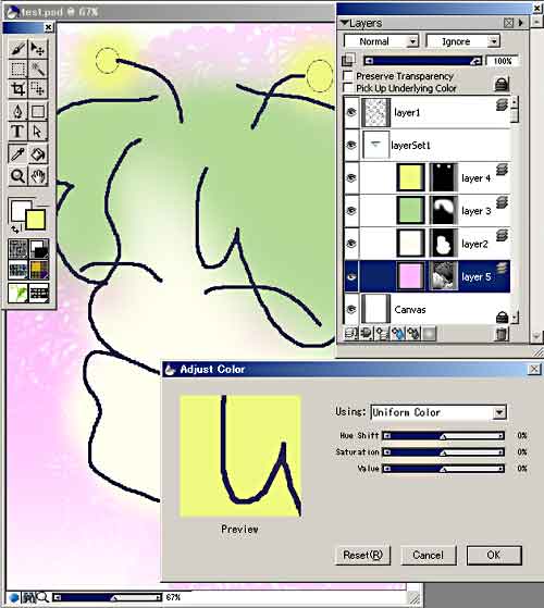さらに、ピンクのレイヤーを選択して「Adjust Color(日本語では色の調整)」をしようとしたら