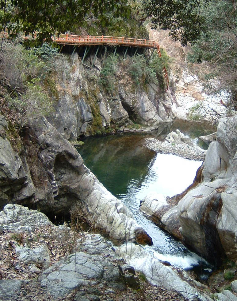 ただ、残念な事に、この淵の一部にもペットボトルが浮いていた。せっかくの景観をなぜ無意味に汚そうとするのか、理解に苦しむ。また、「大蛇が美女に化けてうんぬん」みたいな「由来」を表す立札もあった。景勝地を売る手段としての定番だが、筆者には何でこんな事をするのか理解に苦しむ。こんなベタな話を作る暇があれば、ここの渓谷美について何らかの描写をしたほうが、よほど有意義だと思うのだが・・・。