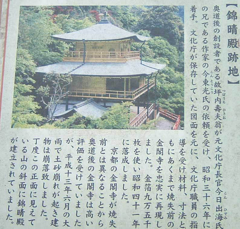 階段を下りると、「錦明殿跡地」という立て札があった。このホテルの創始者の坪内寿夫という人が、消失前の金閣寺を模して9万5千枚の金箔を使って建立したとのことだった。ところが、2001年6月の土砂崩れで崩落してしまい、現在は何も残っていない。。