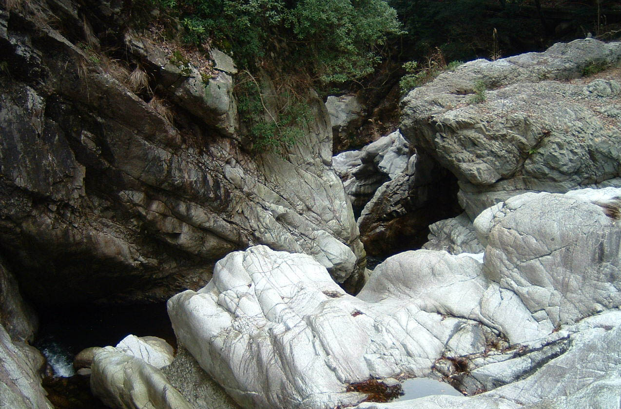 さらに進むと、目的地である「湧が淵」に着いた。巨大な岩がたくさんあり、その隙間を川が流れている。狭いところは30センチくらいになっている。さらに滝もあれば淵もある。短い間で、川が様々な顔を見せて面白い。