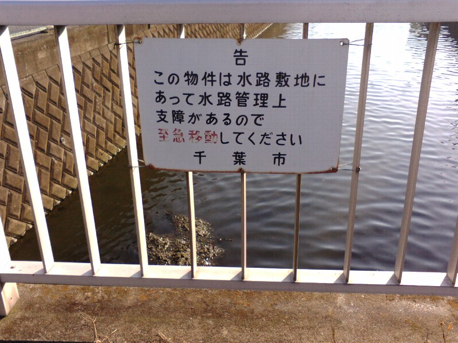 金属板に二色刷で印刷された札だから、本当に千葉市が作成したものなのだろう。しかし、橋および、川面を見ても、「水路敷地にあって、水路管理上支障があるので、至急移動すべき物件」などはどこにも存在しない。