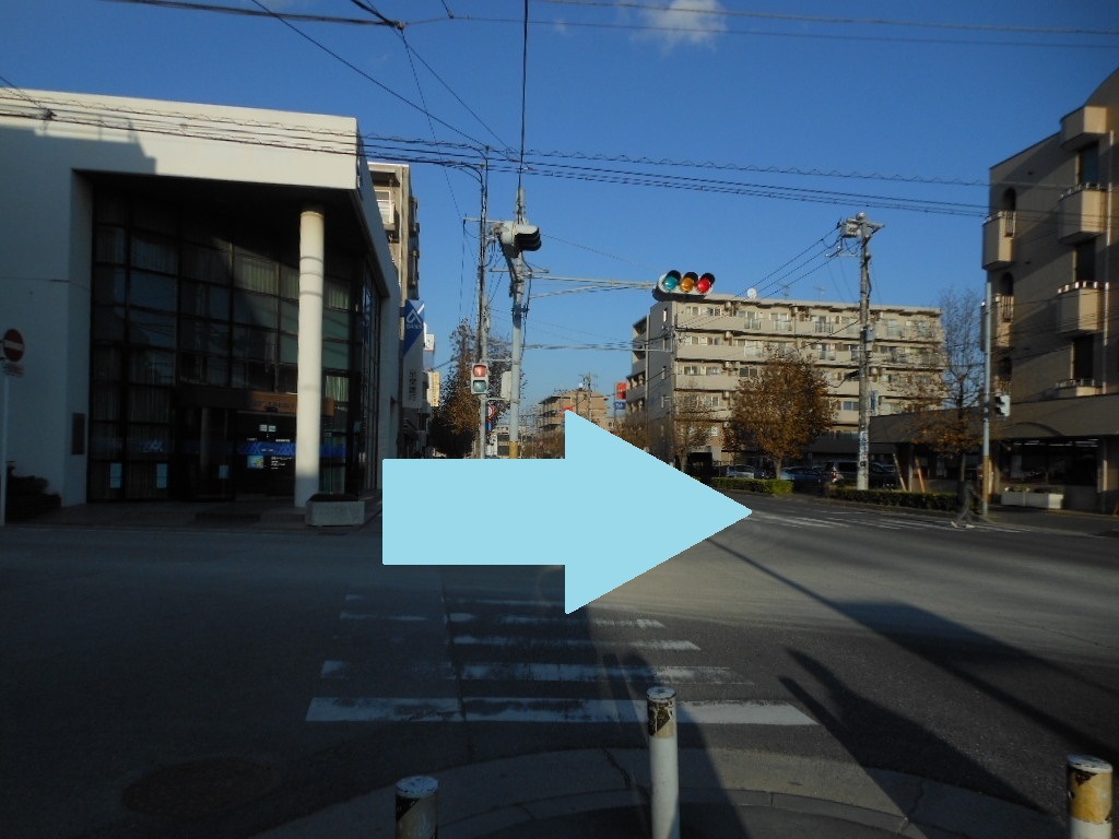 その交差点で体の向きを右に変え、横断歩道を渡る。渡った先の右手には薬局や不動産屋が入っているビルが、また左手奥にはクリーニング店ある。