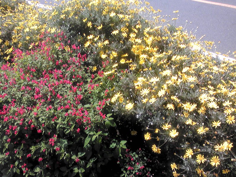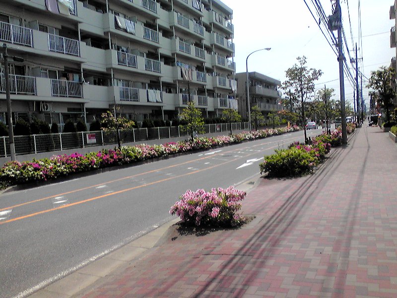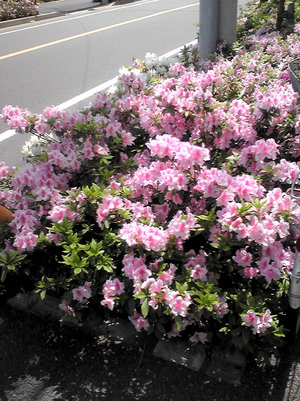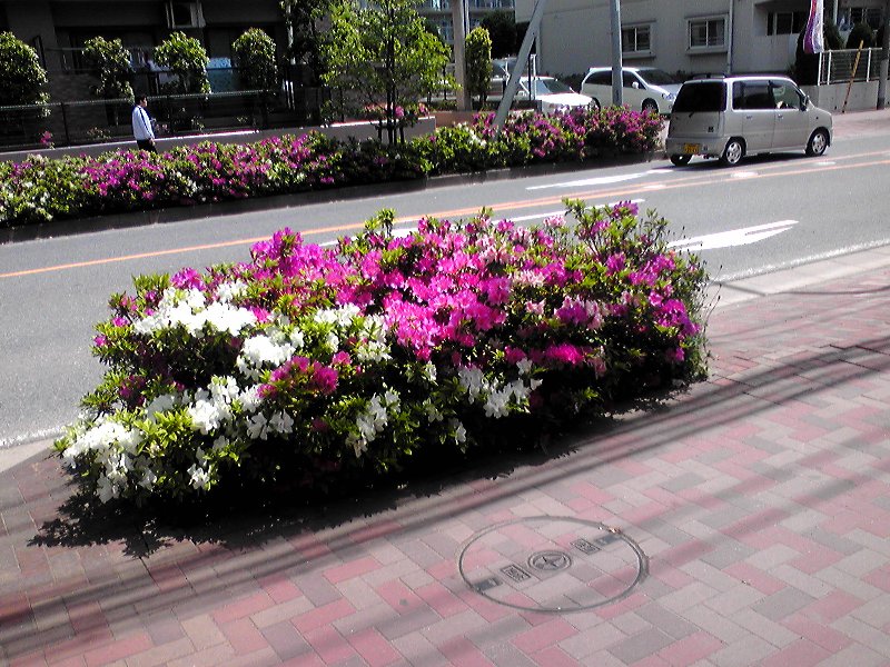 丁字路から京葉道路を渡る区間には、双方の歩道につつじが植わっている。しかも、赤・ピンク・白の三種がそれぞれ配置されているのだ。