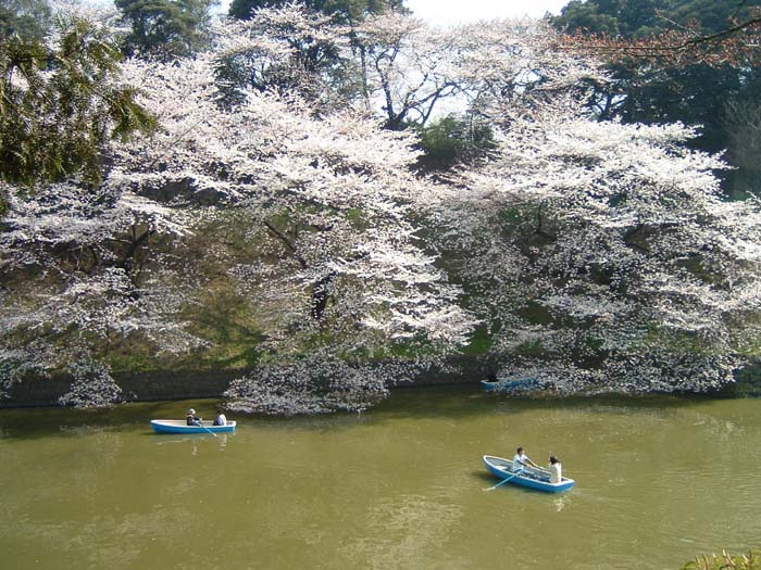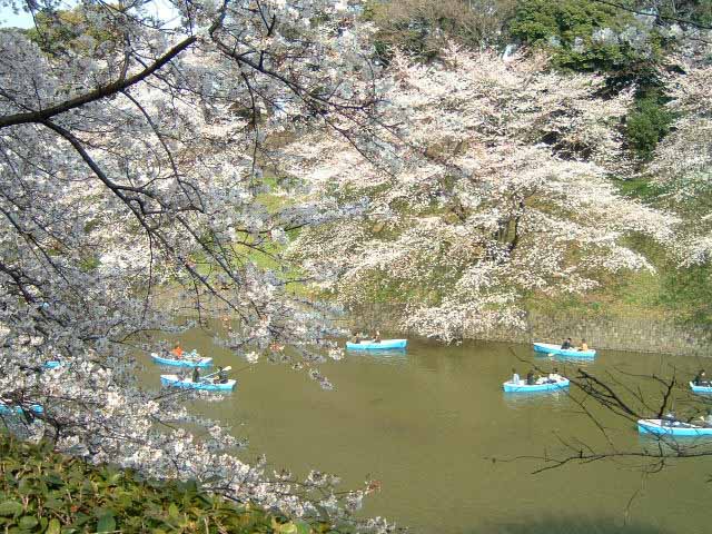 濠では貸しボートも営業している。ボートに乗れば、この桜を間近で見ることができる。もちろん、本日も大盛況で、平日にも関わらず、貸しボート屋には行列ができていた。また、桜とボートとの組み合わせ(写真3)もまたコントラストがあっていい。