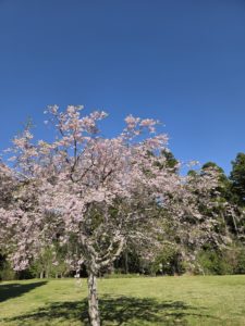 しかし、枝垂れ桜は満開で、雲一つない青空に映えていました。